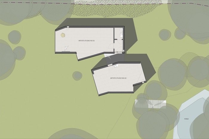 Los estudios están separados entre sí, tienen 40 y 60 metros cuadrados de superficie, y se colocaron sobre los restos de un garaje existente, sin alterar la topografía del terreno. Su uso implica un bajo consumo de energía, principalmente porque son construcciones que tienen un alto nivel de aislamiento. Además llevan una instalación de radiadores eléctricos que solo se activan en determinadas ocasiones. También incorporan una instalación para que el agua de lluvia sea recolectada y almacenada en un aljibe existente.