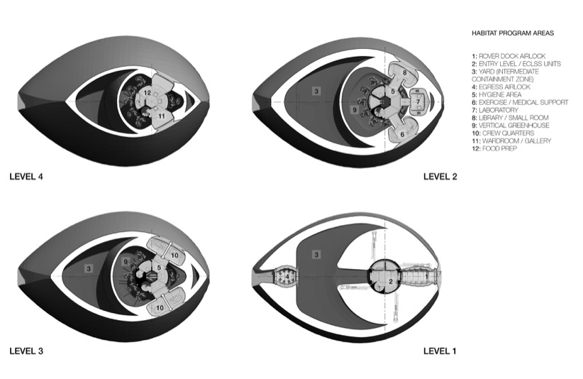 Gracias a las propiedades translúcidas del hielo, sus ocupantes podrán disfrutar de iluminación natural en el interior. Esto es algo muy importante para el equipo de diseño, ya que mantener el ritmo circadiano de la luz solar es fundamental para la salud de la tripulación. Esta casa extraterrestre ofrece espacios de descanso, higiene, laboratorios, y zonas comunes. También permite el crecimiento de vegetación en su interior, a modo de invernadero vertical con cultivos hidropónicos.
