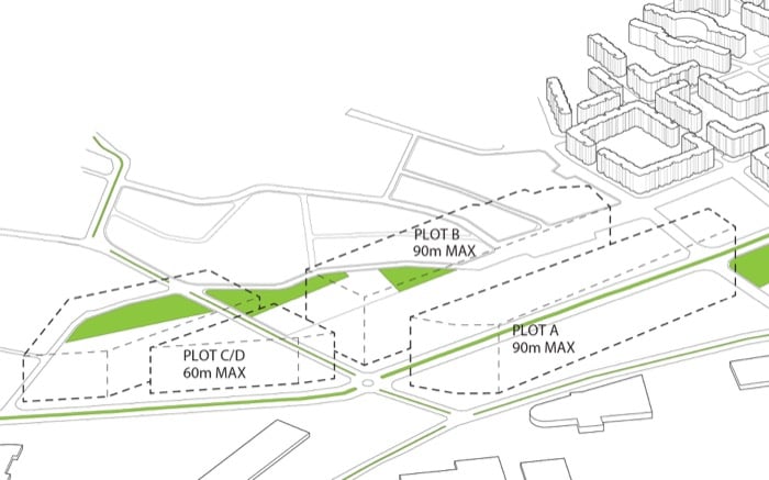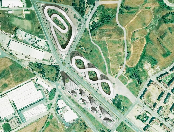 - Parcela B. Está destinada al Parque Infinito. Se caracteriza por tener un largo jardín en la azotea, el cual une diferentes densidades residenciales. Es una especie de ‘ola de viviendas’, cuya forma sinuosa de diferentes alturas va creando patios interiores con equipamiento comunitario.