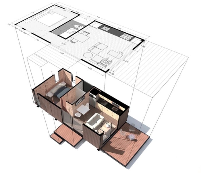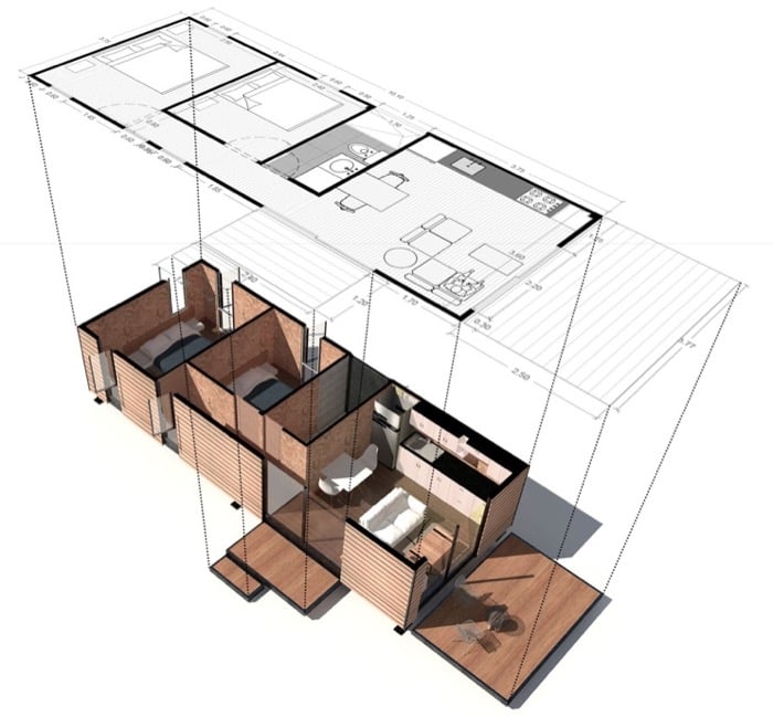 Estamos ante unas viviendas que se fabrican bajo pedido y luego se envían desmontadas al cliente. Luego son ensambladas en el sitio, de una manera rápida y sencilla, empleando un reducido número de herramientas. Su diseño es simple, sin demasiados arficios, pero muy práctico y con buenas proporciones espaciales. Cada uno de los modelos cuenta con una sala para las funciones de la cocina, comedor, y estar. Los dormitorios y cuartos de baño se distribuyen aparte. La sala dispone de puertas correderas que facilitan la entrada de mucha luz natural, y conecta a una terraza exterior.
