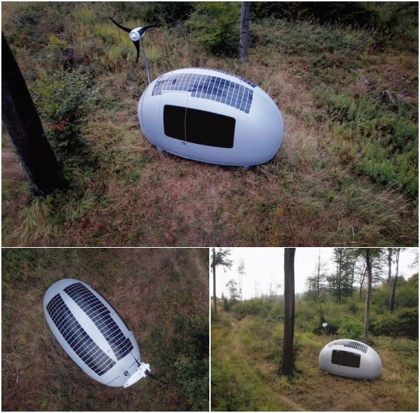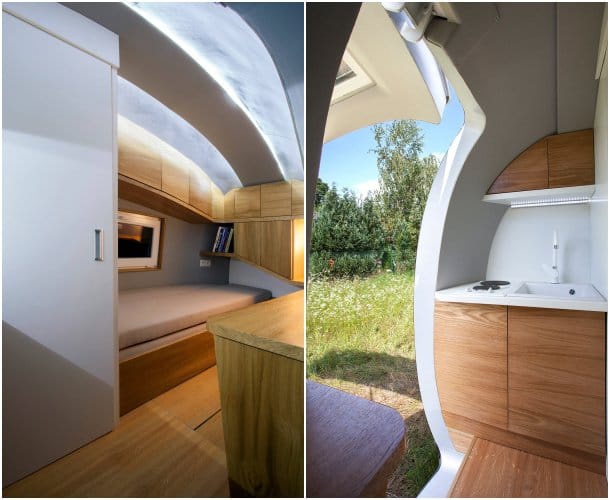 Recordemos que se trata de una especie de refugio, con capacidad para dos personas. Tiene forma de huevo y un espacio interior de 8,2m2 tremendamente aprovechado. Está fabricado principalmente con aluminio, fibra de vidrio, y una buena capa de material aislante. Su equipamiento incluye cuarto de baño con inodoro seco y ducha; cocina con fregadero, y un sofá que se convierte en una cama grande. Además dispone de mucho espacio para el almacenamiento.