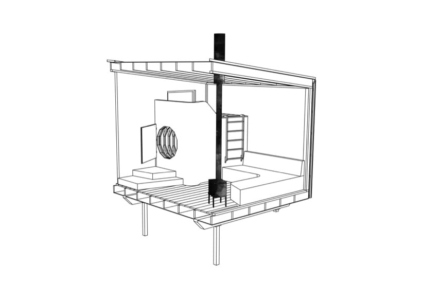El aislamiento térmico se realizó con fibras de madera. El refugio no posee electricidad, ni siquiera mediante paneles solares.