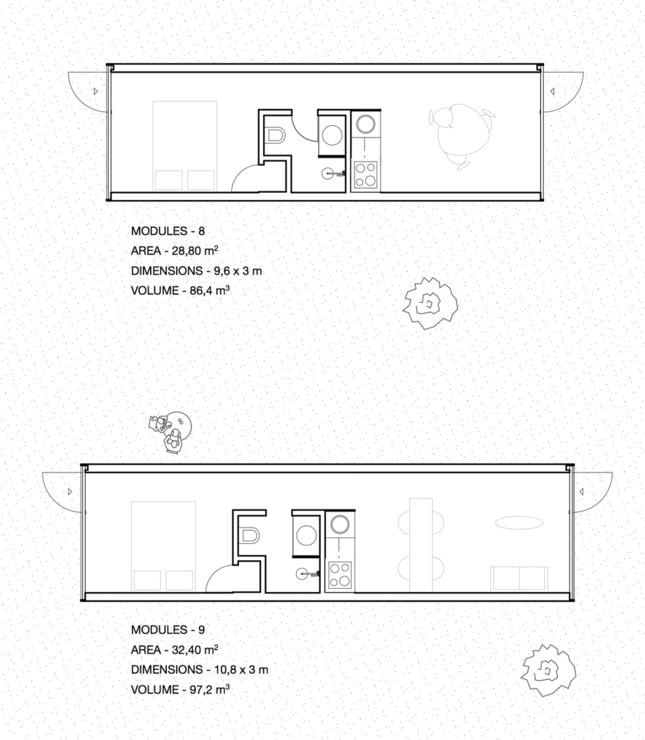 La anchura del módulo es de 3 metros, pero puede alcanzar diferentes longitudes según la configuración deseada (ver planos de planta). En cualquiera de ellas se puede incluir un cuarto de baño (con ducha) y cocina, aunque solamente los modelos más grandes van equipados con espacio de almacenamiento extra. El edificio se puede pedir prácticamente despejado por dentro, o como una casa equipada con el interior ya terminado: paredes, puertas, armario empotrado, baño, cocina, y caldera. Lógicamente el precio varía según el grado de equipamiento seleccionado.