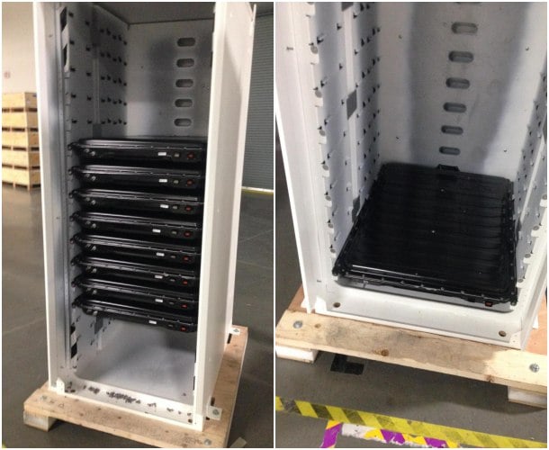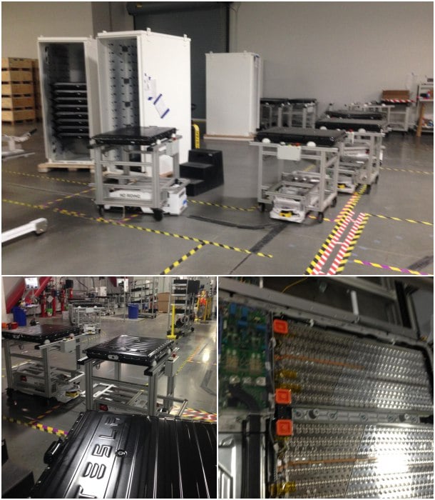 En estas fotos podemos apreciar el aspecto que tiene por dentro ese sector de la Gigafábrica, y algunos detalles relacionados con el ensamblaje de las baterías Powerwall y Powerpack. Recordemos que éstas últimas están diseñadas para tener un desempeño industrial, ofreciendo paquetes escalables a partir de 100 kWh. También vemos que el tipo de módulo que se está apilando en esos ‘armarios’ de las Powerpack, es el mismo que se está utilizando para ensamblar una batería doméstica Powerwall.