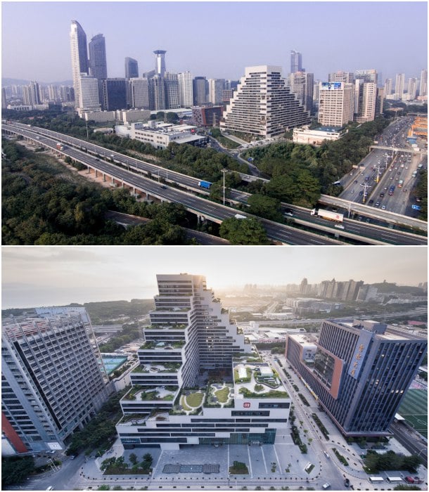 Este edificio de oficinas con jardines en azoteas está localizado en el distrito CheGongMiao de Shénzhen (China). Se diseñó de esa manera para aportar una imagen destacada a escala urbana, pero también para favorecer su interacción humana. Por eso se aleja bastante de la imagen habitual de un edificio de oficinas.