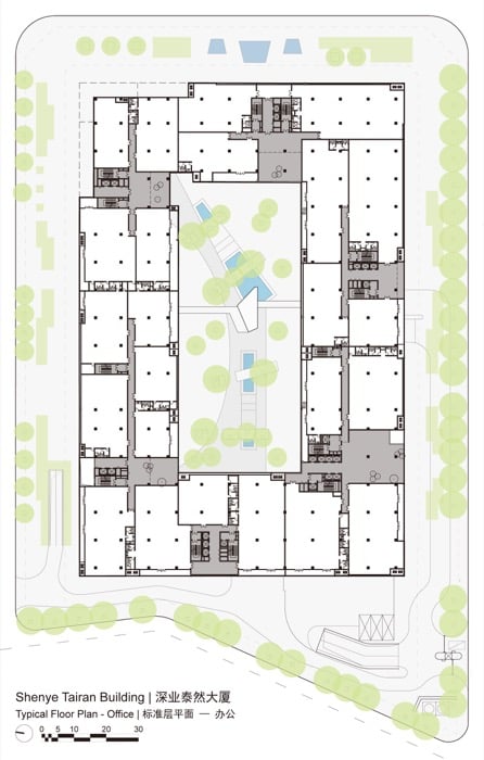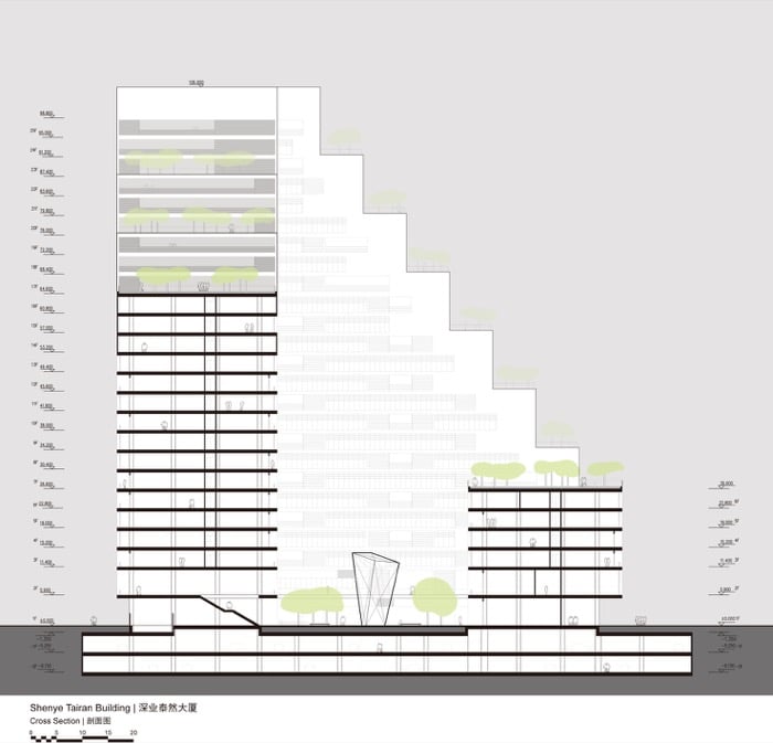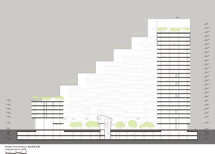 Se le conoce por el nombre de Shenye Tairan. Un detalle interesante es que si se hubiera desarrollado su programa con una solución convencional, se habrían levantado dos torres de oficinas. Estarían separadas unos 100 metros, y con el típico podio comercial debajo. En lugar de eso, el proyecto se llevó a cabo mediante un volumen continuo, que recorre el perímetro de la parcela. Esta disposición permitió construirse lo más cerca posible de la calle. En la esquina suroeste se construye hasta la altura máxima permitida, y de ahí va descendiendo escalonadamente.