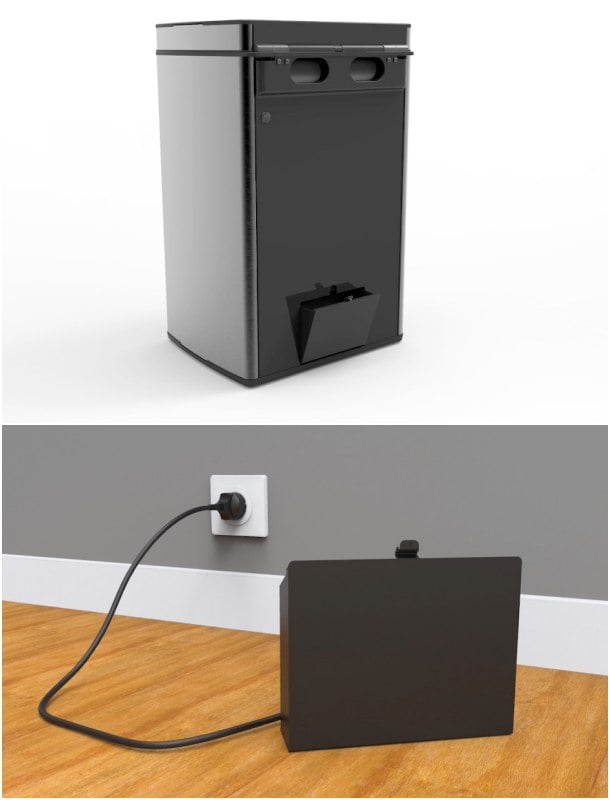 - Todos los elementos de este cubo inteligente de basura han sido diseñados para consumir el mínimo de energía posible, pero también para ser fácilmente reciclados o reutilizados.