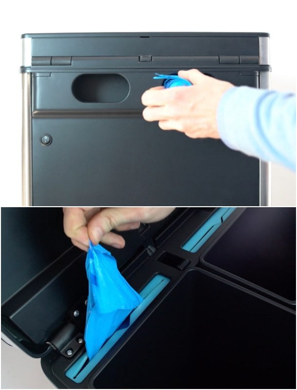 - Las bolsas de basura se guardan dentro de QUBE. Se introducen los rollos por dos compartimentos traseros, y se extraen desde dentro del cubo. Se hace cuando se levanta la tapa, a través de sus rendijas azules.