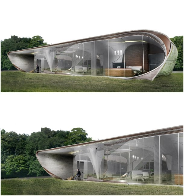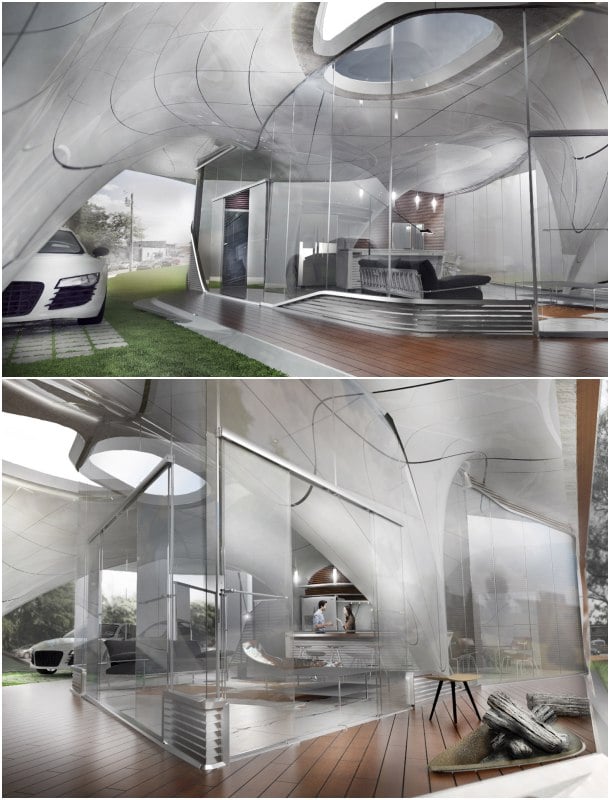 Estos renders son de una propuesta de vivienda muy especial. Estaría hecha con paneles de plástico y fibra de carbono que son fabricados por impresión 3D. Se trata de Curve Appeal, un proyecto que posee una estructura llena de curvas, formada por paneles que sirven para crear la piel exterior y el núcleo interior. Tal combinación permite formar la cubierta y gran parte de la fachada, dando lugar por tanto a una casa por impresión 3D.