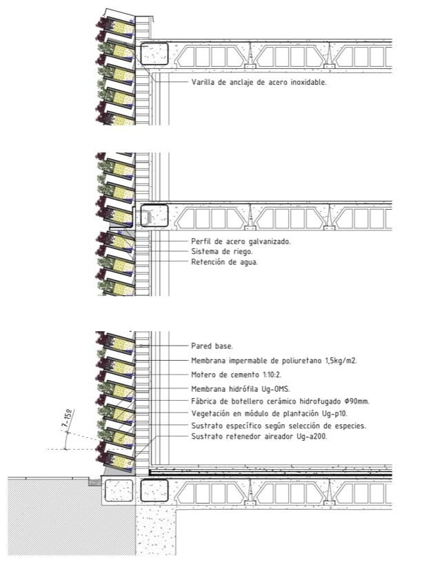 Como se puede apreciar en el detalle constructivo, la fábrica de piezas cerámicas se ejecuta sobre una pared base existente. Primero se aplica una membrana impermeable, luego se construye la fábrica cerámica, colocándolas inclinadas (7-15º) con mortero y conectores de alambre de acero inoxidable (ø4mm). Dependiendo de la altura del jardín, puede que sea necesario utilizar algún perfil de acero intermedio que reciba la carga de las siguientes filas de botelleros.