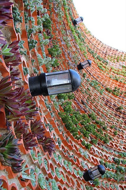 En vez de irse a complicados sistemas de jardín vertical, se decidió por una instalación más simple, del tipo Eco.bin. Este jardín utiliza como soporte una fábrica de botelleros cerámicos, que aportan huecos estupendos para el sustrato y la vegetación. El conjunto funciona como un bello muro de absorción acústica.