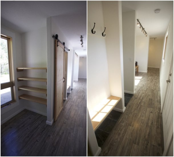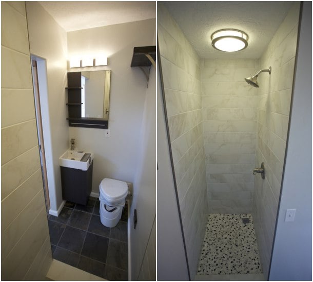 Como se puede observar, externamente aún conserva su acabado corrugado. Se abrieron los huecos para las ventanas y la puerta de entrada. Dentro se aplicó una capa de material aislante proyectado, y se montó la tabiquería que organiza el espacio. El acabado interior finalmente es de paneles de yeso, con carpinterías y suelo de madera. Dispone de un cuarto de baño con lavamanos, inodoro de compostaje, y una ducha que tiene las paredes alicatadas de azulejo cerámico.