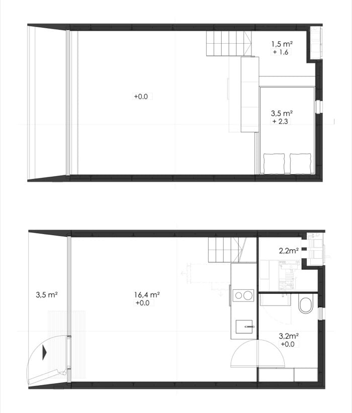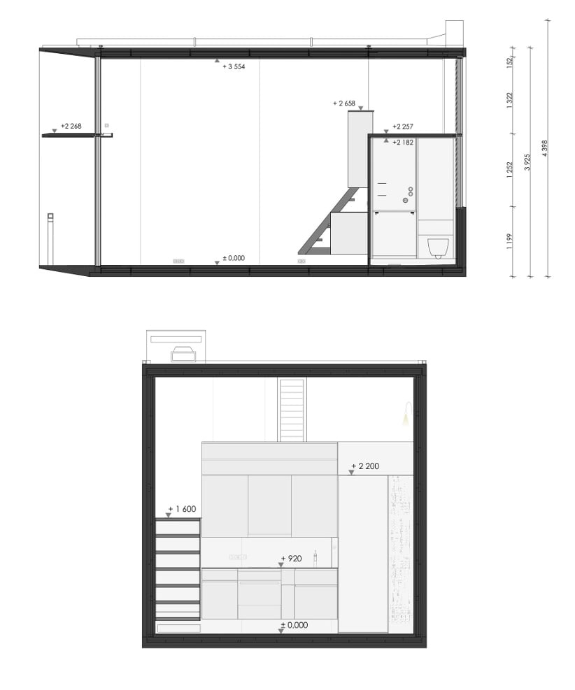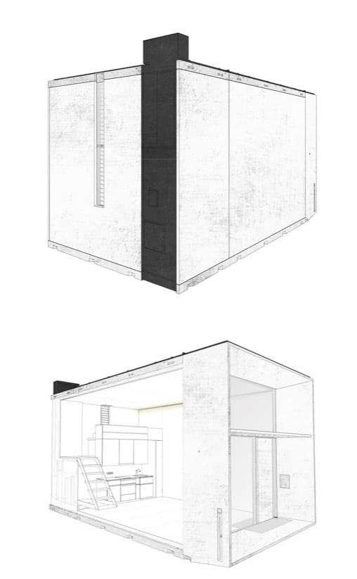 La estructura de esta casa está hecha con 9m3 de hormigón armado. Son losas que ya llevan incorporado un buen aislamiento. El edificio tiene una altura libre interior de 3,55 metros, suficiente para permitir un altillo con una cama grande. En la parte inferior de este módulo está la cocina y el cuarto de baño. El resto es un espacio multifuncional con mucha luz natural.