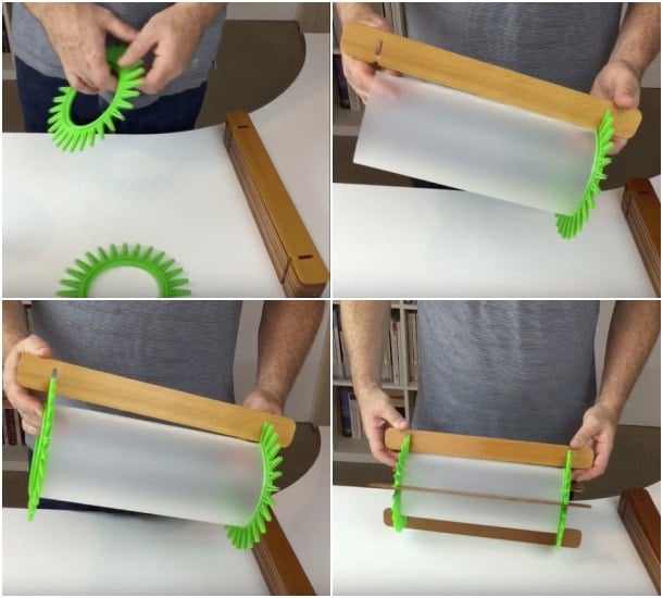 El artista no tuvo más remedio que construir su propia plantilla. Esto le permitió trabajar con listones de madera de hasta 2,5 metros de longitud. También se asoció con un taller local de reparación de persianas, que en vez de tirar los componentes no deseados, se los daba a Adrian.