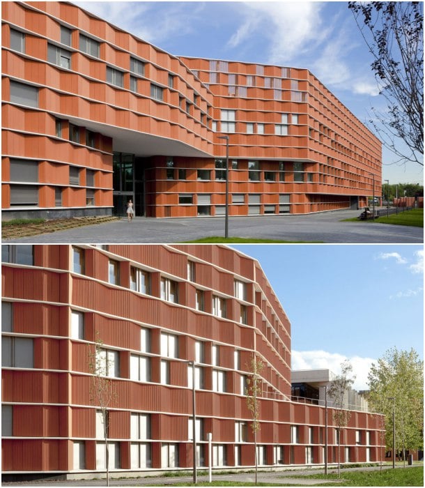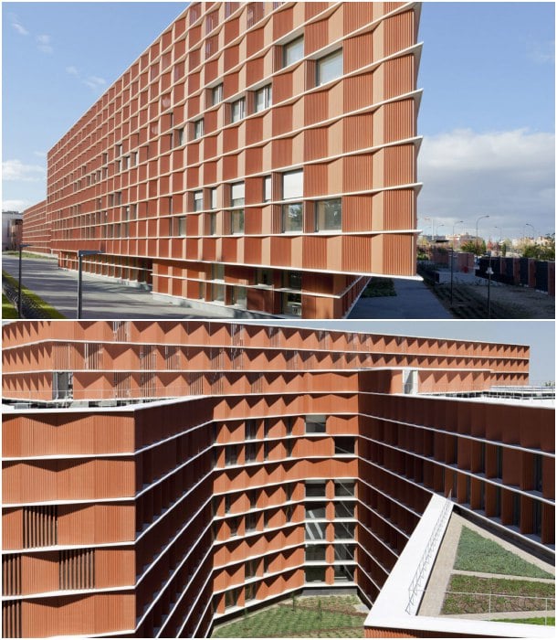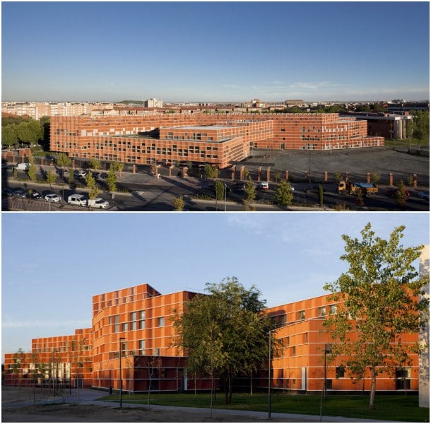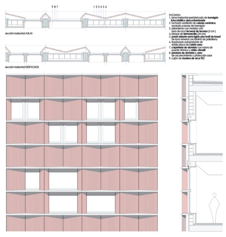 La parte que más nos interesa de este proyecto es su carácter sostenible. Ha sido tal, que le ha valido para ser el primer edificio educativo en España que consigue una certificación LEED Platino. Posee una estructura de hormigón armado, con soportes colocados cada 2,2 metros. Este ritmo se traduce en su fachada ventilada, y sirve para modular los espacios interior. La distancia de 11,4m entre pórticos se resuelve con losas postensadas. La fachada está formada por piezas cerámicas, creando un repetitivo patrón de pliegues. Tal vez demasiado reiterativo.
