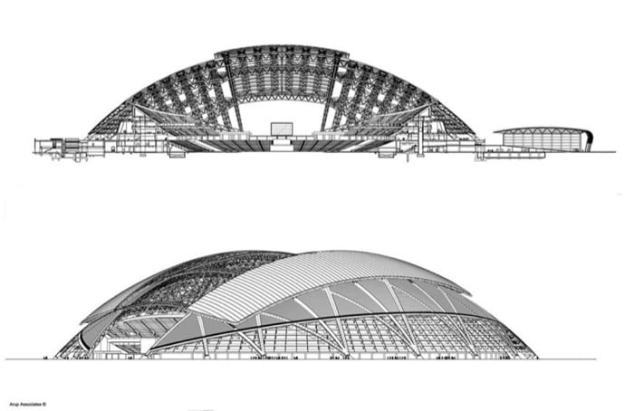 El proyecto con esta gran cubierta retráctil fue realizado por DP Architects, que contó con la colaboración de AECOM. La construcción, como no podía ser menos, corrió a cargo de ARUP.