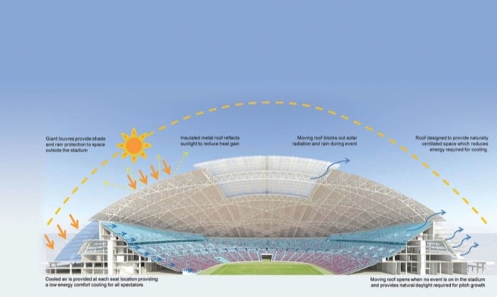 En el estadio, 55.000 espectadores pueden disfrutar cómodamente sentados de todo tipo de espectáculos. Es un espacio refrigerado que tiene cubierta retráctil, y algunas gradas plegables, con el fin de dar cabida al mayor número de actividades deportivas. Por todo ello, es el primer estadio del mundo (diseñado a medida) capaz de albergar competiciones de atletismo, fútbol, rugby, y críquet, adaptando sus instalaciones en tan solo 48 horas.