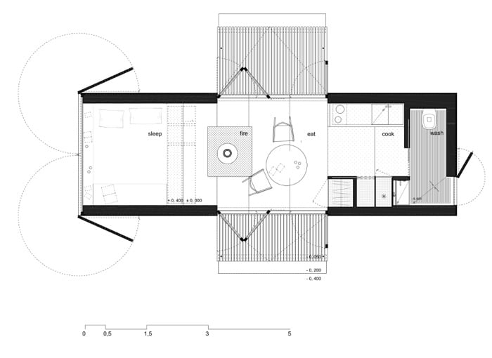 En total, tiene una superficie útil (sin terrazas) de 28m2. Es un espacio único donde se organizan todas las funciones. En el centro está la zona para comer, en un extremo la cama, y en el opuesto la cocina y el cuarto de baño. El frontal del dormitorio está completamente acristalado. En cada lateral existen puertas plegables acristaladas, que sirven de acceso a una terraza exterior. Estas terrazas son unos paneles de listones de madera que, al abatirlos sobre la fachada, sirven para cerrar por completo la cabaña. Este mismo sistema se ha utilizado para las ventanas del baño y dormitorio, pero se abaten según un eje vertical.