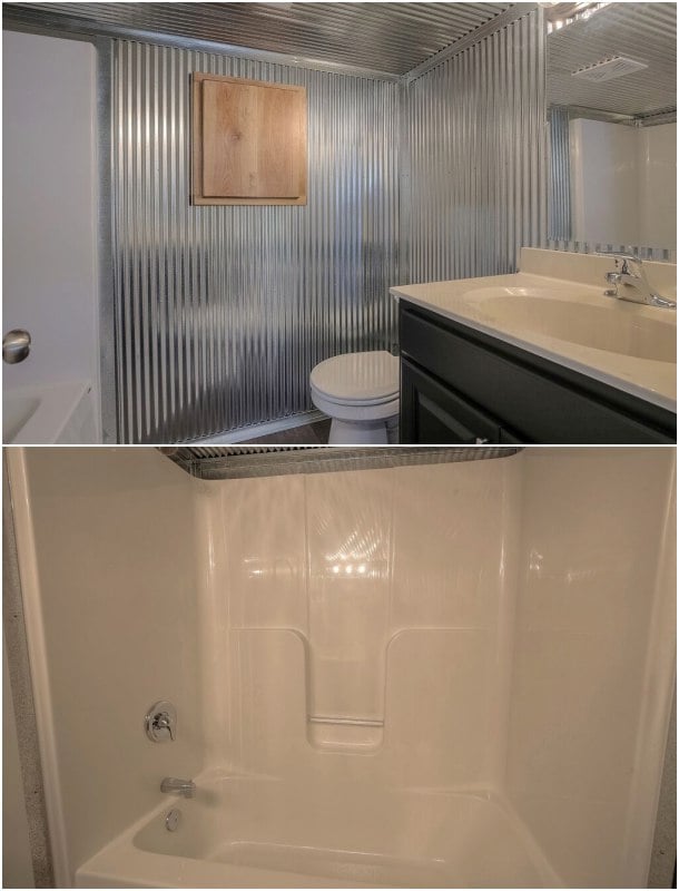 El cuarto de baño está ubicado al fondo del contenedor. Es un espacio revestido íntegramente de chapa antioxidante, y que cuenta con lavabo, inodoro, y una bañera/ducha de material acrílico.