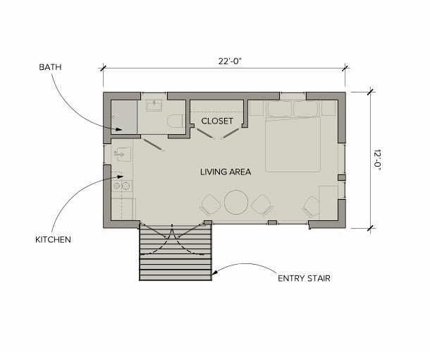 - De 264 pies (24,53m2). Es una pequeña estructura que tiene 22’x12’. Dentro posee un espacio multifuncional con cocina, hay un pequeño baño, y armario empotrado.