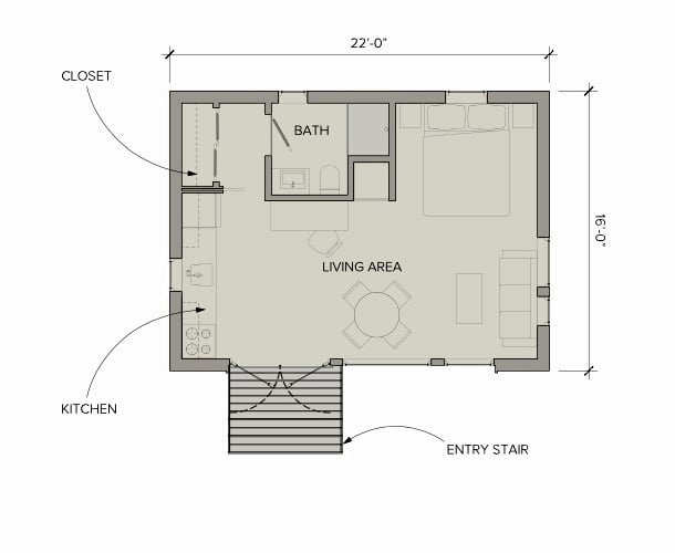 - 352 pies (32,70m2). Esta casa tiene más anchura, con unas dimensiones de 22’x16’. Sigue teniendo un espacio para varias funciones, con una cocina incorporada, que ahora es un poco más larga. El cuarto de baño también es un poco más grande. Hay dos armarios empotrados.
