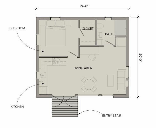 - 480 pies (44,59m2). Este modelo ha crecido en los dos lados, pues mide 24’x20’. También tiene una organización más cómoda, con una habitación independiente para utilizar como dormitorio. La cocina sigue estando en el salón, pero es más grande, y en forma de “L”. El baño es un poco más amplio. Como en el modelo anterior, la sala incluye un pequeño armario, pero en el dormitorio se ha añadido un vestidor.