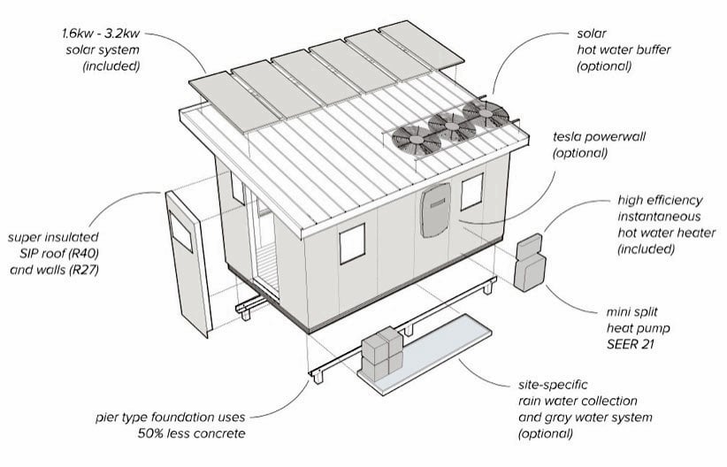 Esta vivienda en kit puede funcionar sin estar conectada a las redes de suministro. Esto es así porque de serie incluye unos paneles fotovoltaicos (alquilados), aunque existe la posibilidad de tenerlos en propiedad, e incluso de añadir una batería de Tesla. Su funcionamiento es muy eficiente, debido a la gruesa capa de material aislante (R40 en cubierta, y R27 en muros).