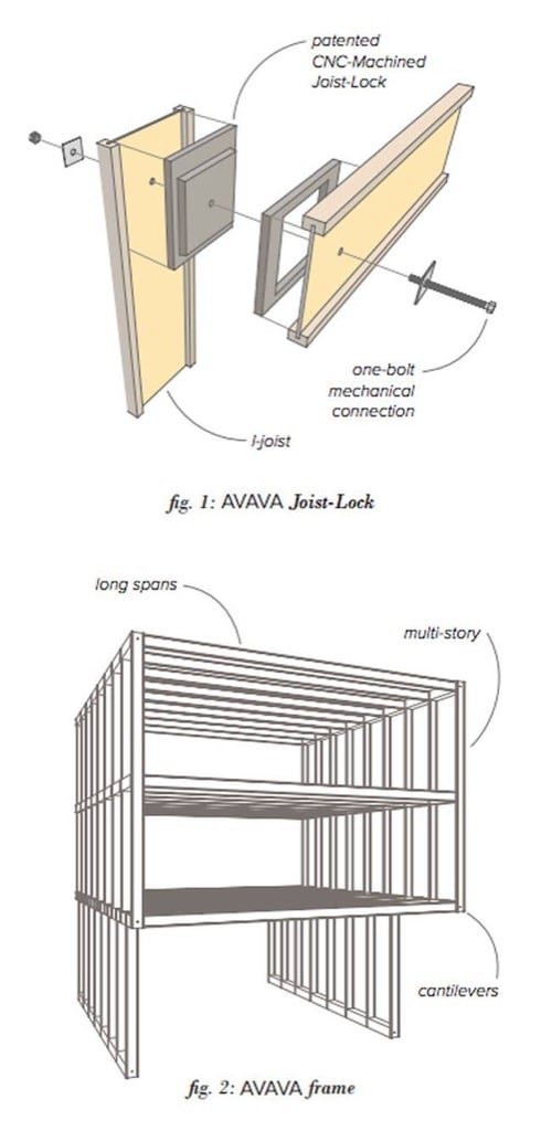 Inspirándose en los perfiles de acero, se ha creado un perfil de madera con forma de “I» (I-Joist). El alma de este elemento estructural está compuesto por un panel OSB. Cada ala de la viga es un listón de madera maciza. Este elemento I-Joist puede funcionar como viga, pero también como soporte. Estas vigas y soportes se unen en «nudos rígidos” (Joist Lock) compuestos por unos elementos cuadrados, que finamente se fijan con un perno. Con esta conexión patentada se pueden crear estructuras rígidas de madera, sin necesidad de pegamento alguno. Son resistentes a acciones horizontales de viento y sismo.