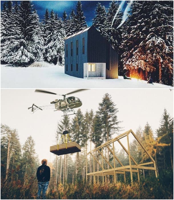 Como si de un mueble se tratara, esta moderna cabaña se entrega en embalajes planos, para que se pueda transportar con facilidad, y ensamblar sin complicaciones en el sitio.