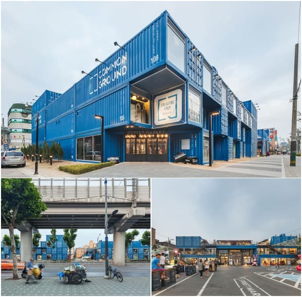 Common Ground es un proyecto de arquitectura modular muy interesante. Fue el primero y más grande centro comercial del mundo, hecho con contenedores marítimos. Se construyó en la capital de Corea del Sur empleando para ello unos 200 módulos de transporte, con los que se alcanzó una superficie de 5.300m2.