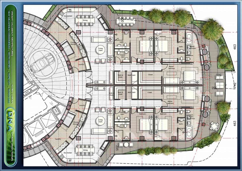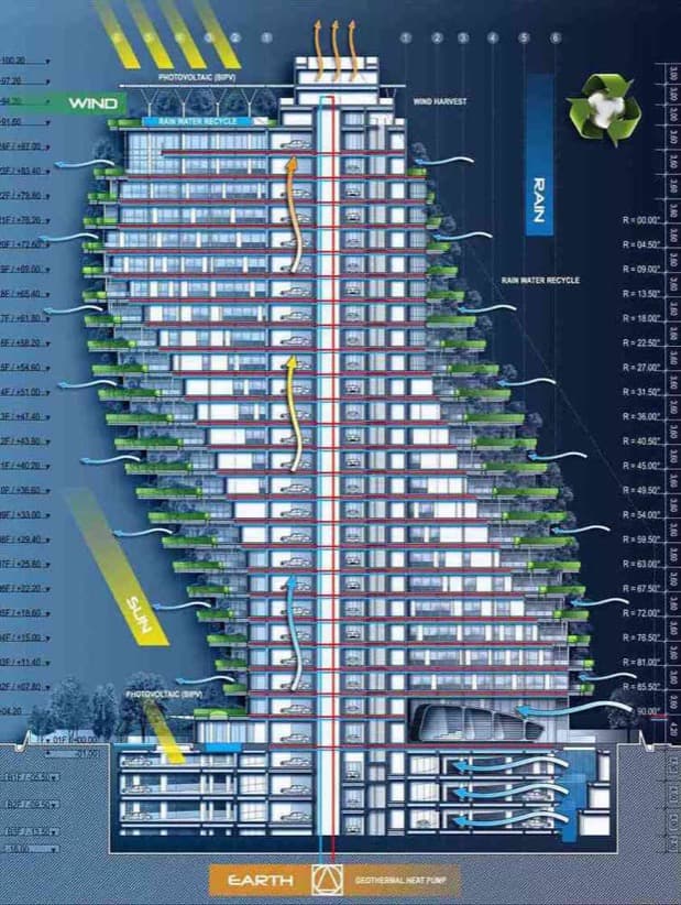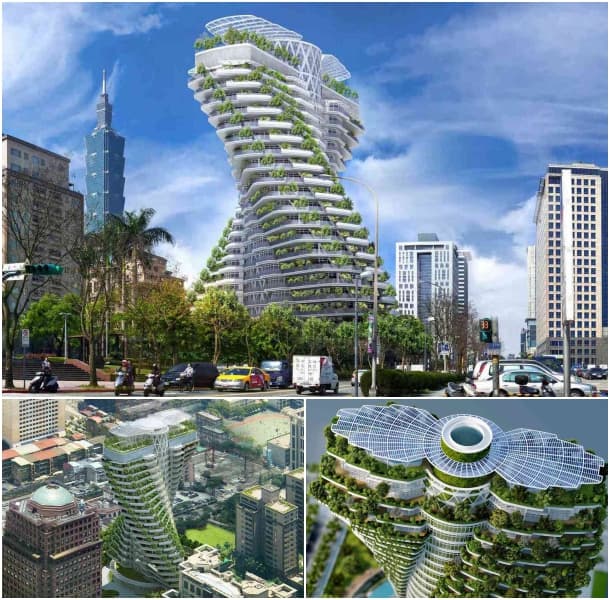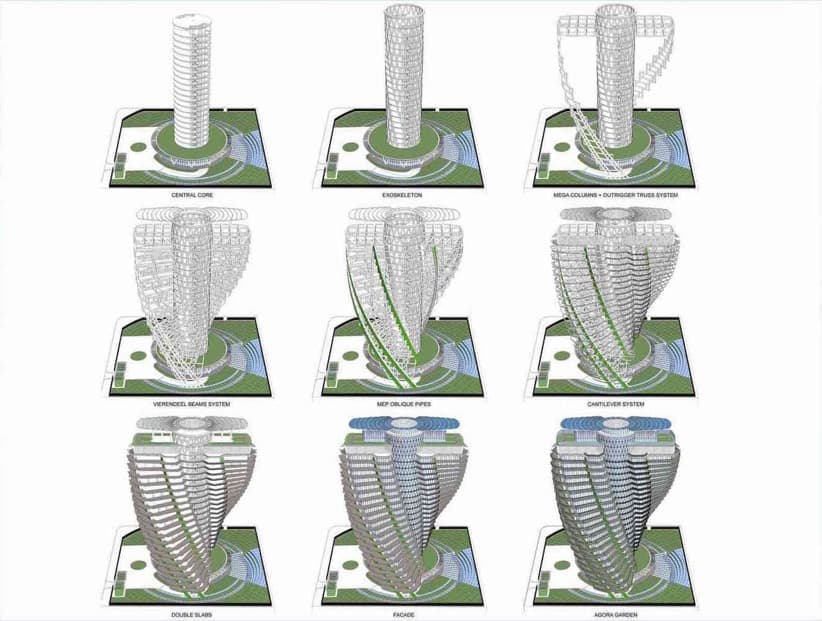 Junto a una cuidada selección de imágenes renderizadas, este artículo también incluye fotos realizadas durante su construcción. El proyecto de este condominio de viviendas de lujo se ubica en el distrito Xinjin de Taipei (Taiwán). Surgió de un concurso internacional de ideas, organizado en el 2010. Su forma retorcida está inspirada en la cadena de ADN (doble hélice), tiene 20 pisos de altura, donde cada nivel va rotando 4.5 grados. Esto hace que la torre realice un giro de 90º desde su base hasta la coronación.