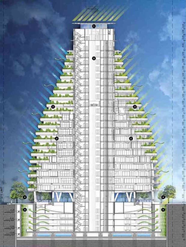 En este edificio los árboles tienen gran protagonismo, pues están presentes en su fachada, desde la base hasta la cubierta. La intención no es otra que la de convertir a esta torre en una simbiosis entre ser humano y naturaleza. El autor lo llega a definir como «un gran árbol habitado”, estimando que sus especies vegetales tienen una capacidad de absorción de 130 toneladas de CO2 al año.