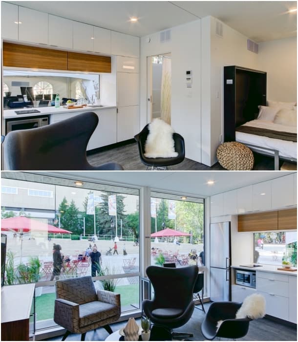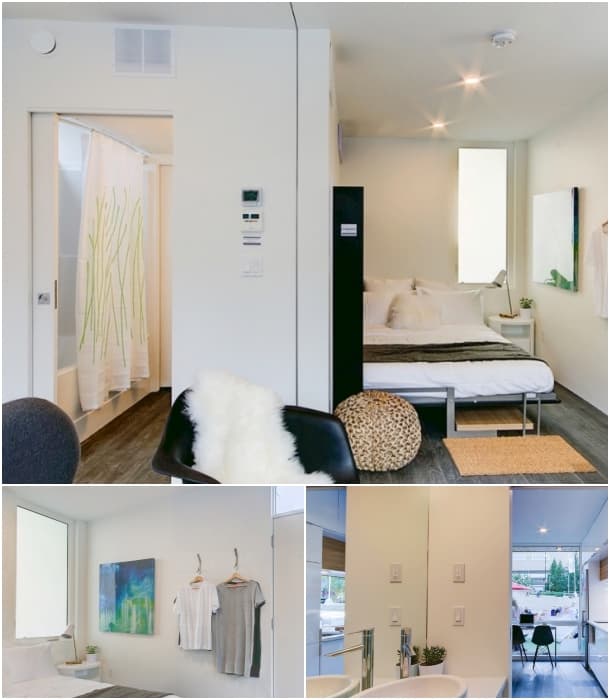 - HO2. También es un estudio, pero de 32,7m2, con unas dimensiones de 16 x 24 pies. Aquí el espacio es más confortable, con cocina y baño con bañera. El dormitorio es un anexo al salón. Las fotos de la galería corresponden a este modelo.