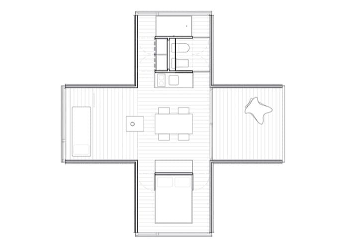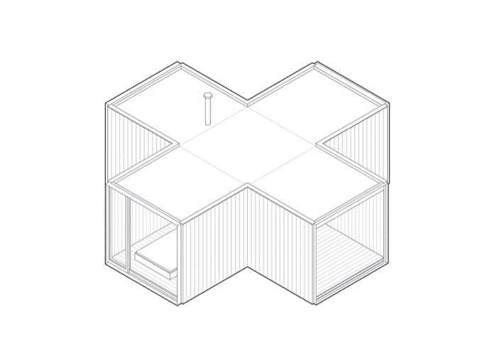 En la cima de una colina se colocó un refugio, con los módulos formando una cruz. El cuerpo central es un espacio vacío, ocupado por una mesa de comedor. Hay un módulo para la cama grande, otro con dos literas, un cuarto módulo que sirve de terraza, mientras que el quinto es el que contiene las zonas húmedas (baño y cocina). Cada extremo de este refugio mira a un punto cardinal diferente, por lo que es fácil contemplar la naturaleza.
