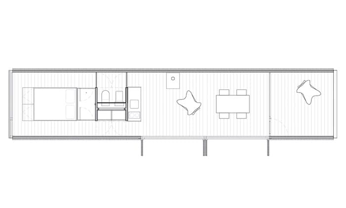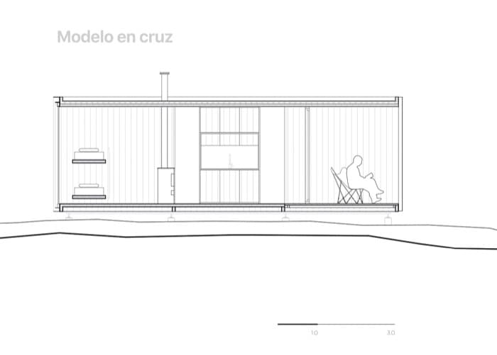 El segundo refugio está situado dando la espalda al camino de acceso. Se abre a un pequeño estanque que hay en el lado sur de la hacienda. También se utilizaron cinco módulos minimod, pero en esta ocasión se organizaron de manera lineal. Uno de los extremos lo ocupa el módulo-terraza, mientras que en el lado opuesto está el único dormitorio que tiene esta casita. En cambio, la zona multifuncional destinada a cocina-comedor-sala, es más espaciosa.