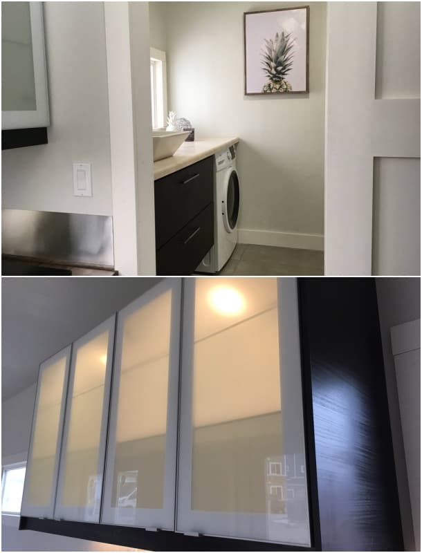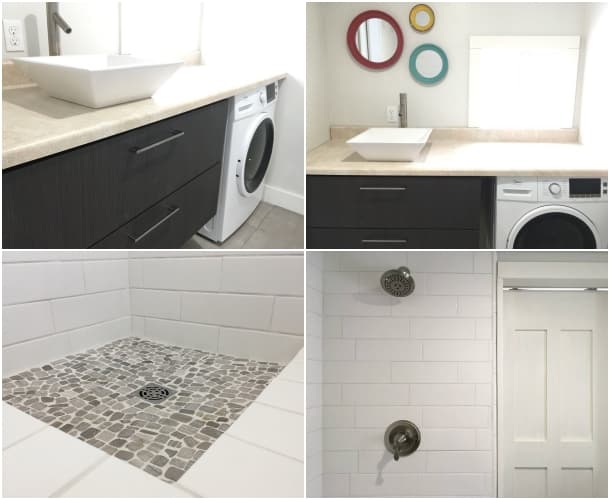 En un extremo del contenedor se ha metido el cuarto de baño. Tiene ducha, un mueble con lavabo, y está equipado con una máquina lavadora/secadora. A él se accede por una puerta corredera de madera, que está pintada de blanco.