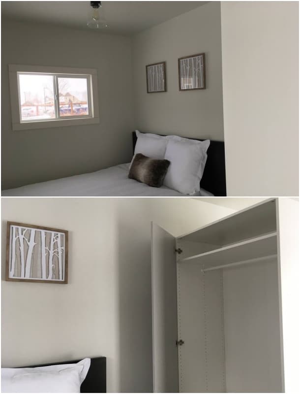 Casi todo el espacio de este hogar viene definido por los muebles. Un armario separa el dormitorio (con cama de matrimonio) de lo que debe funcionar como salón-comedor. La cocina está completamente amueblada, e incluye un frigorífico grande (con congelador). También vemos una placa de inducción, horno microondas, lavavajillas, fregadero, y armarios superiores.