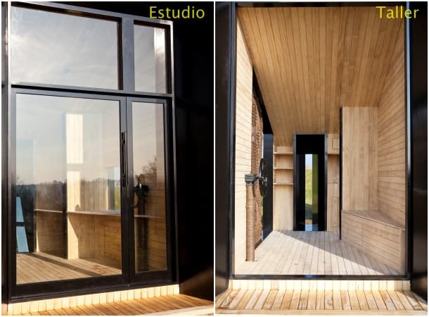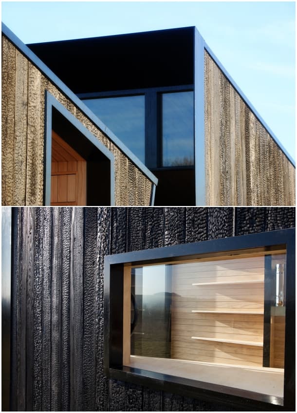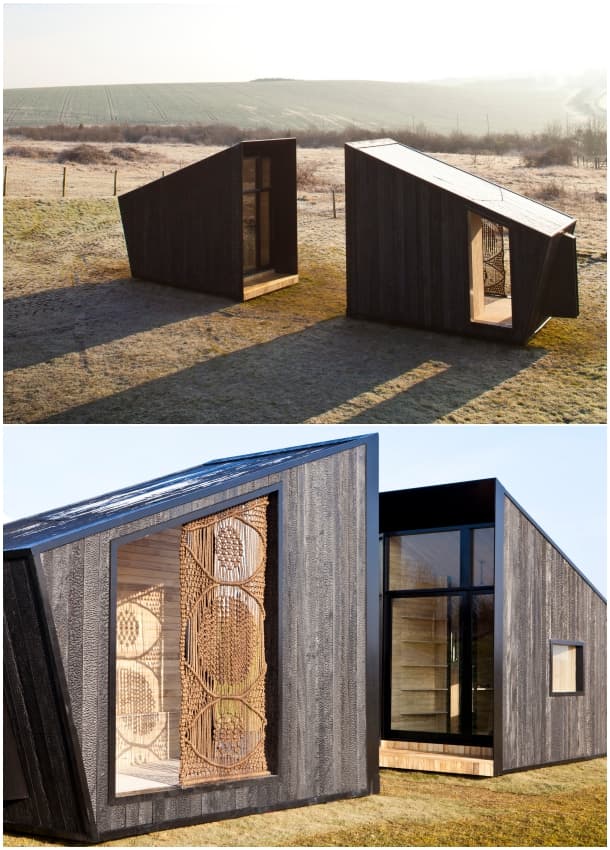 Ambas estructuras se fabricaron en una nave industrial, siguiendo un proceso que duró 11 semanas. Están hechas con perfiles de acero y paneles de madera. El exterior está revestido con tableros de madera carbonizada, siguiendo la técnica japonesa shou-sugi-ban. De esta forma se alarga su durabilidad.