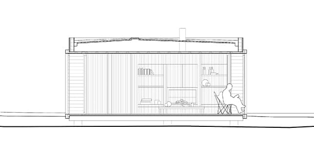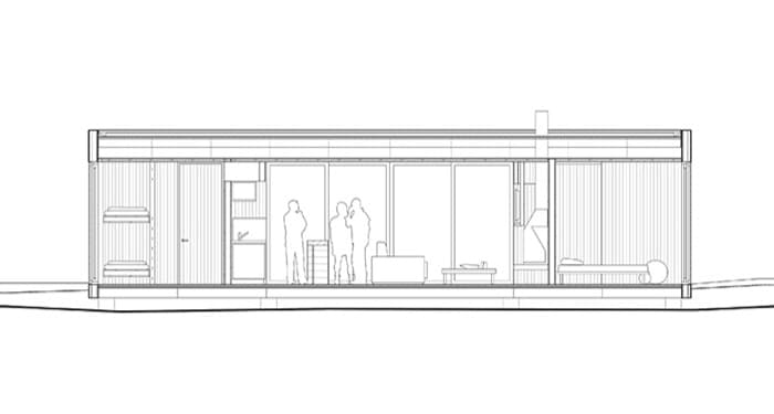 Este pequeño edificio prefabricado tiene el espacio de vida en el centro. Ahí se agrupa la sala, comedor, y la cocina. Los muebles y electrodomésticos quedan encajados en la pared, dejando un espacio más despejado. A un lado de esta sala está el dormitorio principal, que tiene baño propio. En el extremo opuesto está la segunda habitación, pero con baño compartido.