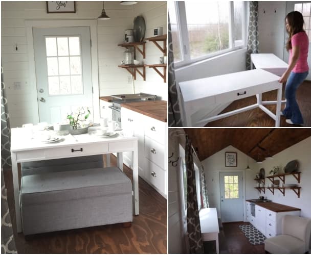 El prototipo que construyó la familia White incluye algunos detalles muy prácticos que se podrían añadir en esta versión con baño. Un ejemplo es la encimera de la cocina. Tiene tableros que ocultan los dos senos del fregadero. En el vídeo se puede ver éste y otros detalles.