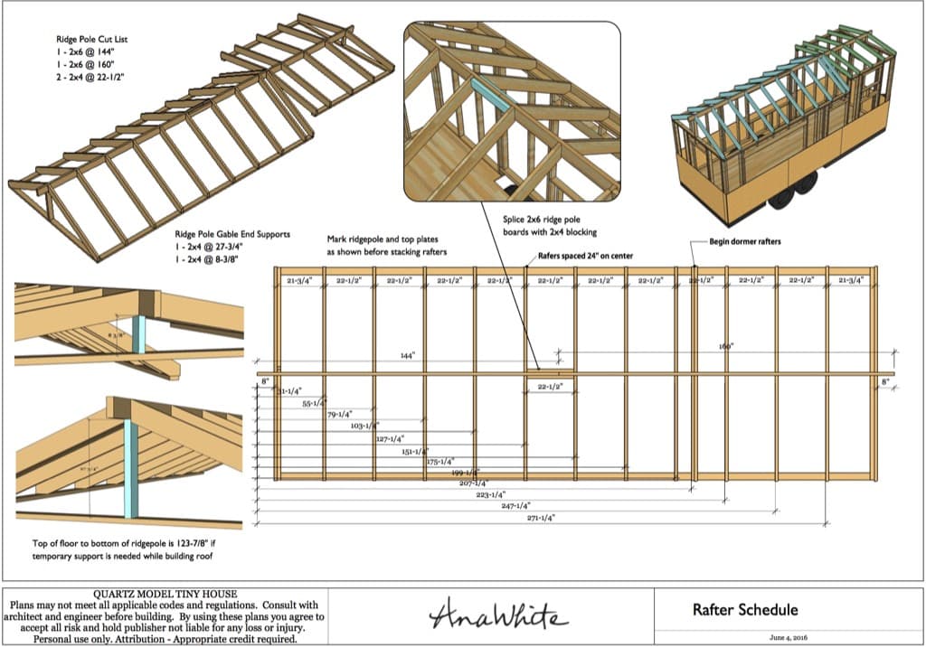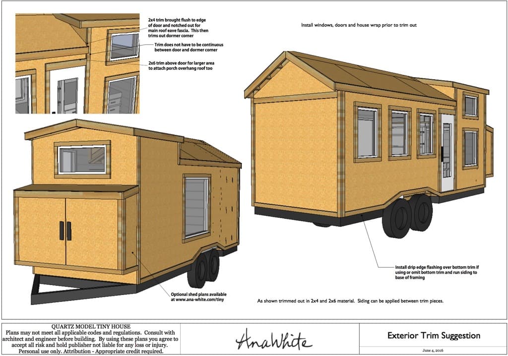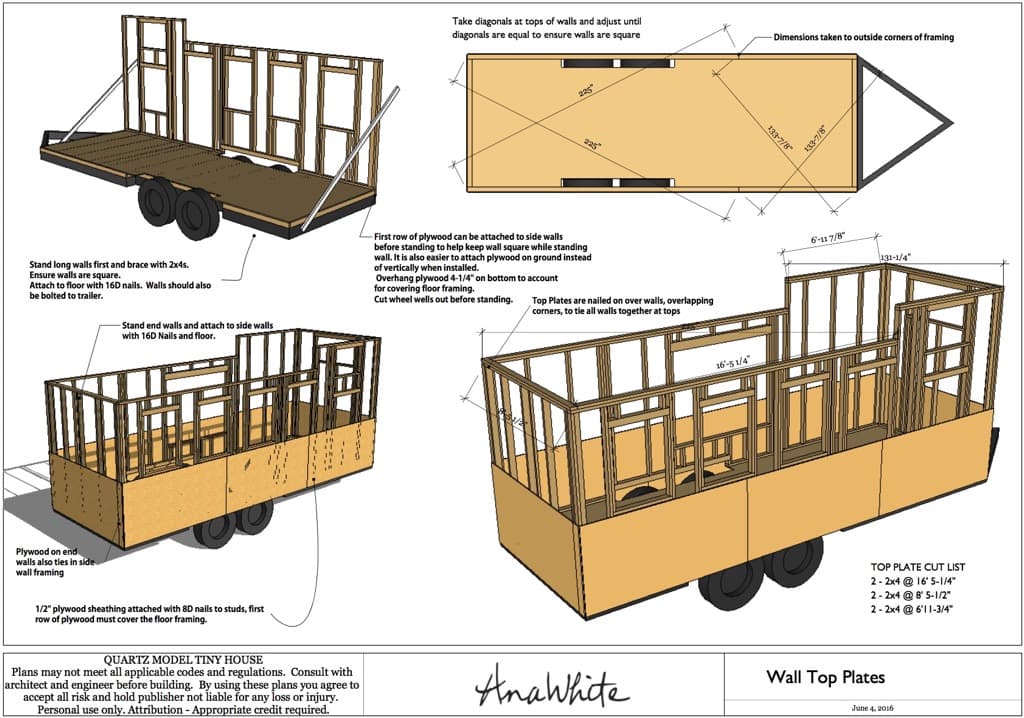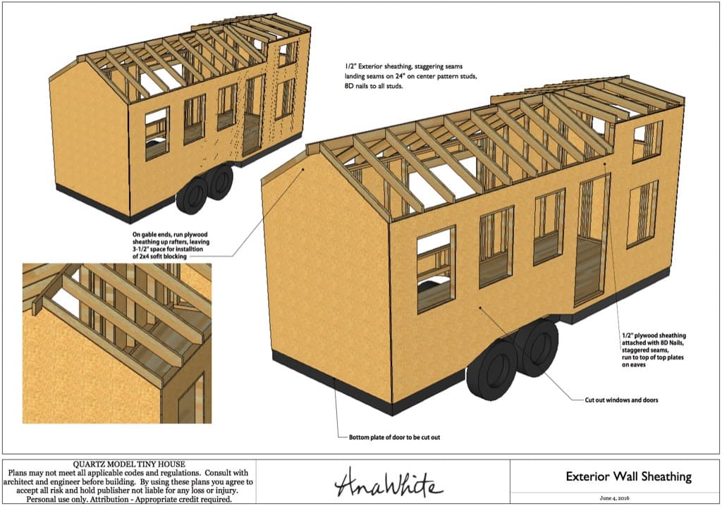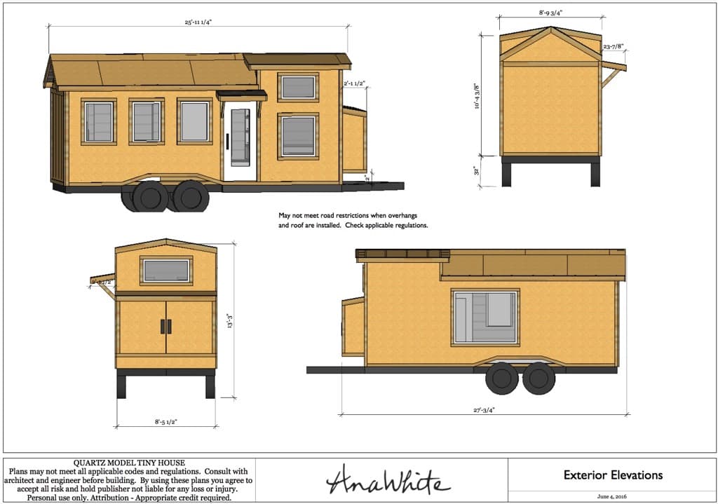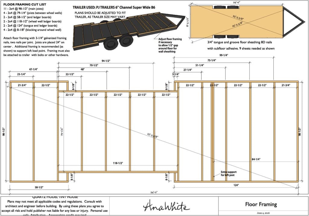 La casita Quartz está construida sobre un remolque de 24 pies (731,5cm) de largo, y 8’6’’ (259cm) de ancho. Esta pareja utilizó exactamente el trailer PJ Super Wide Channel B6, por lo que todas las medidas que se encuentran en los dibujos están dadas en base a ese modelo de remolque. Si vas a construir esta casita sobre un trailer de otro tamaño, entonces tendrás que adaptar (según tu criterio) los planos de esta casa.