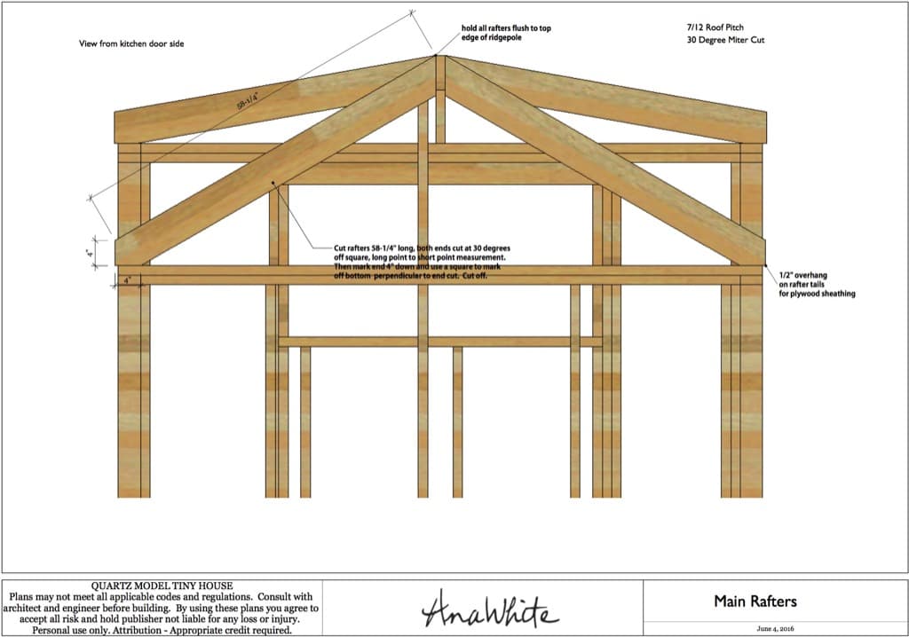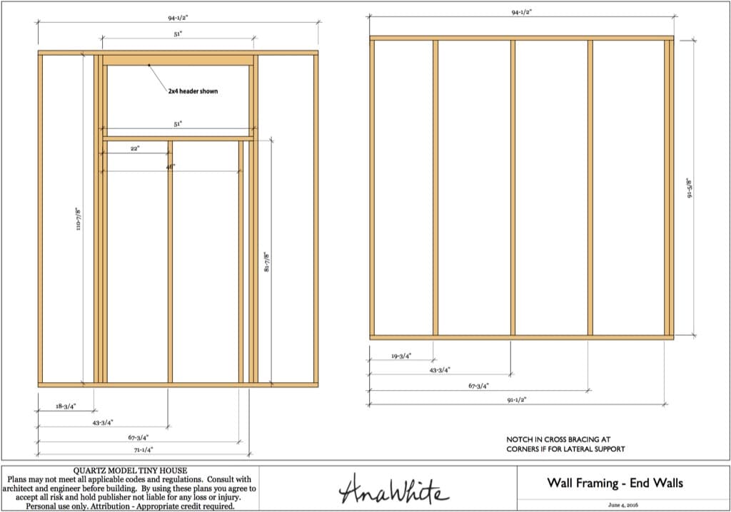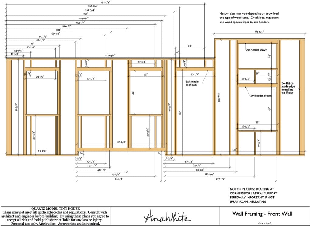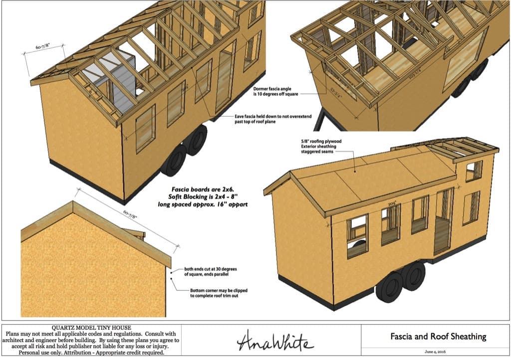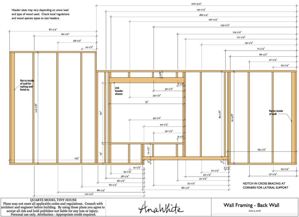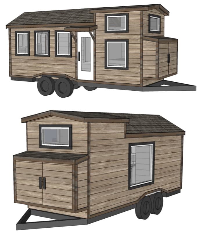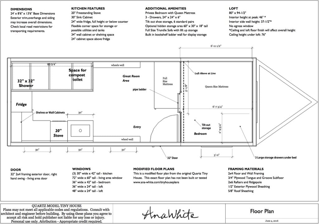 La casita Quartz está construida sobre un remolque de 24 pies (731,5cm) de largo, y 8’6’’ (259cm) de ancho. Esta pareja utilizó exactamente el trailer PJ Super Wide Channel B6, por lo que todas las medidas que se encuentran en los dibujos están dadas en base a ese modelo de remolque. Si vas a construir esta casita sobre un trailer de otro tamaño, entonces tendrás que adaptar (según tu criterio) los planos de esta casa.