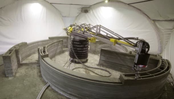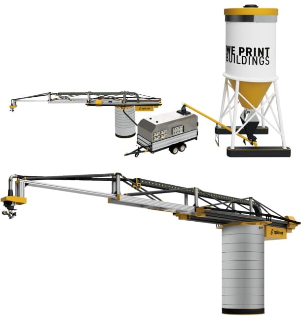 Con esta gran impresora se puede imprimir una estructura de una planta. La máquina tiene un brazo de impresión colocado sobre una columna que permite un giro de 360º. El brazo puede operar desde 1,5 hasta 3,1 metros de altura, y además es telescópico, con una longitud variable entre 4 y 8,5 metros.
