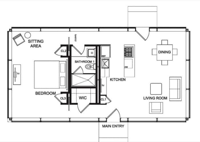 - Modelo de 1 dormitorio. Tiene una longitud de 12.43 metros, y una anchura de 6.48m. Su superficie es de 80.55m2.