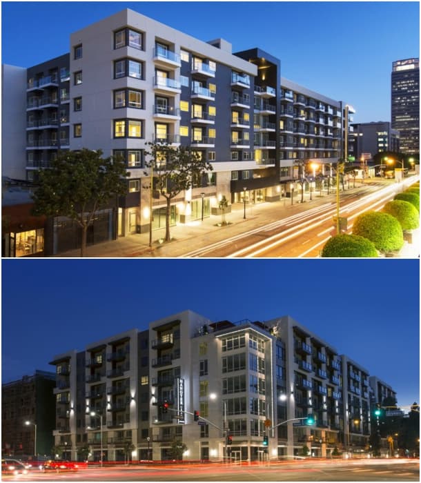No es normal que un edifico de viviendas plurifamiliares (condominio) disponga de una instalación de energía renovable. Esto ocurre en los apartamentos Hanover Olympic de Los Angeles, que 20 de sus unidades están alimentadas con placas solares. Esto lo convirtió en el primer edificio de apartamentos de energía cero de la ciudad.