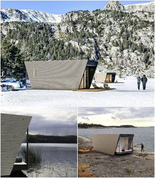 Esta construcción ofrece buenas panorámicas desde su interior. En la entrada hay una terraza, y en cada extremo del módulo la fachada se inclina. Este gesto hace que su diseño sea inconfundible, y elegante.