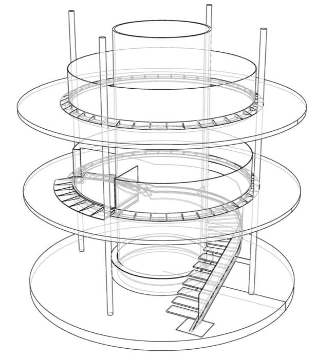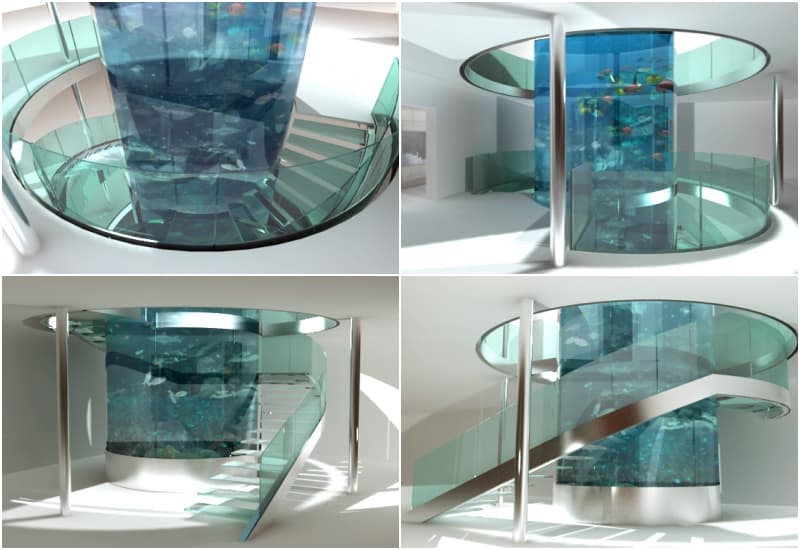 El primer elemento estructural de esta escalera lo constituye una viga cajón de acero. Los peldaños son de vidrio, y están en voladizo, sin entrar en contacto en ningún punto con el acuario. La escalera además está protegida lateralmente por una elegante barandilla de vidrio.