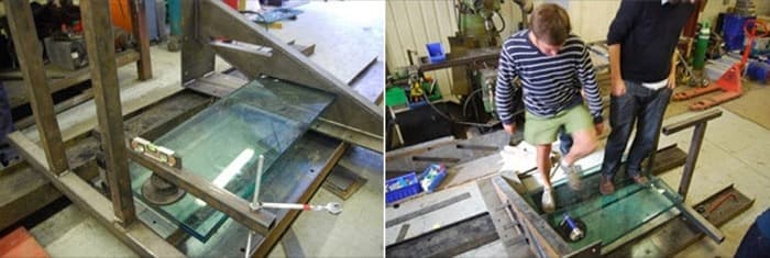 Los peldaños están hechos con vidrio laminado estructural de 40mm de espesor. Cada uno de ellos está insertado en la zanca metálica, a través de unos huecos previamente practicados en su lateral (ver fotos). La barandilla está hecha con vidrio laminado termo-endurecido, de 15mm de espesor. Va fijado a un lateral de la viga de la escalera.