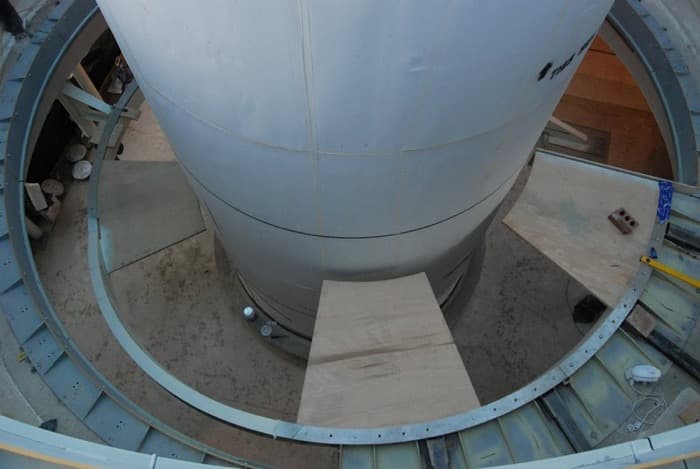 La viga directriz arranca de una placa base de acero, que está anclada a la estructura del edificio. Pero también se apoya en dos puntos intermedios de su trazado, a unos pilares metálicos próximos. (Esto no estaba reflejado en los renders originales de su diseño).