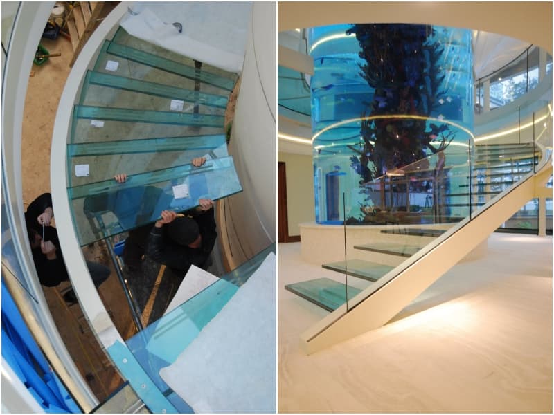 Estas imágenes tienen que ver con una alucinante escalera helicoidal de vidrio que se montó para una residencia de lujo. Aportamos también detalles que enseñan algo del “cómo se hizo”.